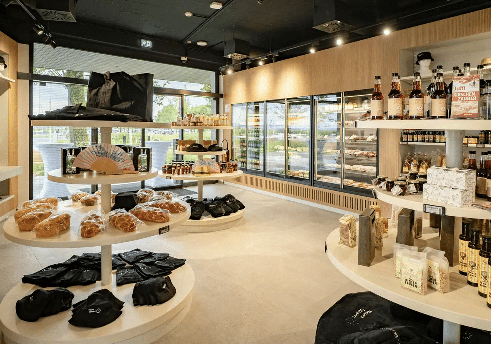 Essen to go und zwar ausschließlich aus der Region wird in der angrenzenden Greißlerei geboten. Neben feinen Wurstspezialitäten und ausgesuchten Weinen gibt es zahlreiche weitere handverlesene Köstlichkeiten. „Durch unser modernes Selbstbedienungskonzept steht Ihnen das alles sogar rund um die Uhr zur Verfügung.“