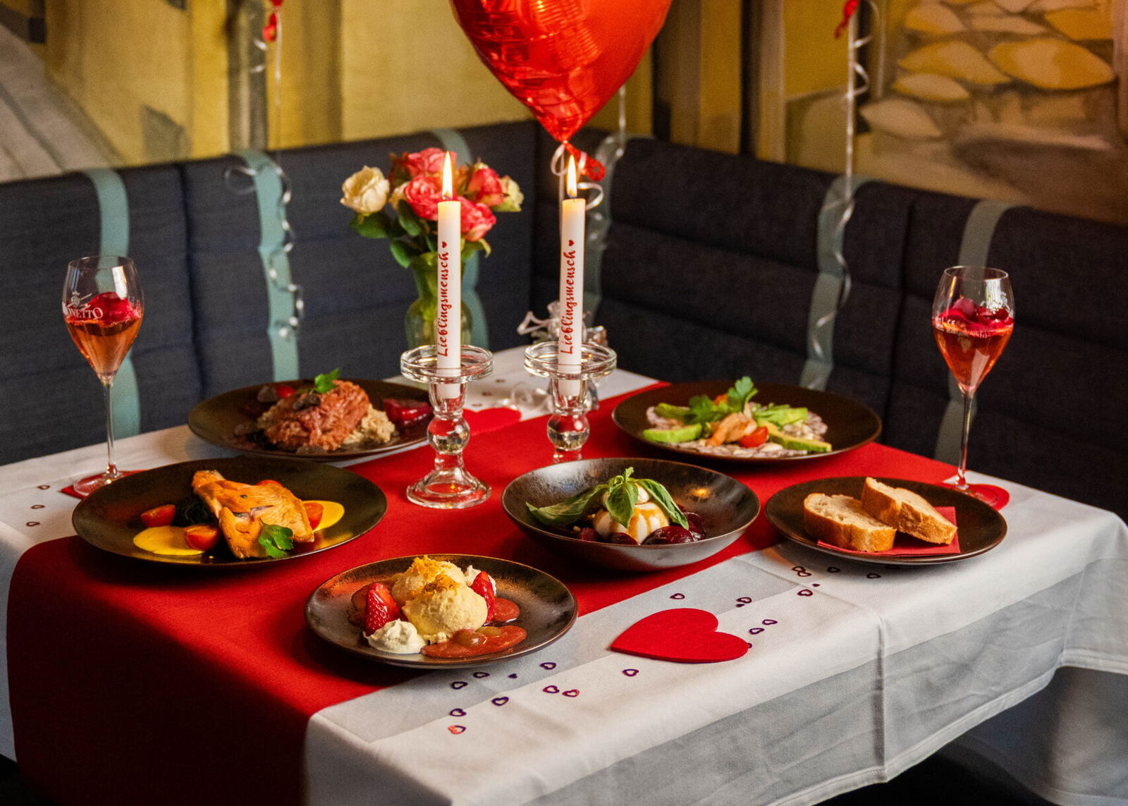 Zum Valentinstag lädt das Restaurant Stefanie zu einem stilvollen 4-Gang-Menü inklusive Aperitif ein. Freuen Sie sich auf feine Klassiker wie Rote-Rüben-Carpaccio mit Ziegenkäse, weiße Tomatensuppe, Filetsteak vom österreichischen Weiderind oder überbackenes Lachsfilet mit Ravioli sowie ein Schokoladensoufflé als süßen Abschluss. Ein genussvoller Abend in elegantem Ambiente – perfekt für besondere Momente zu zweit.