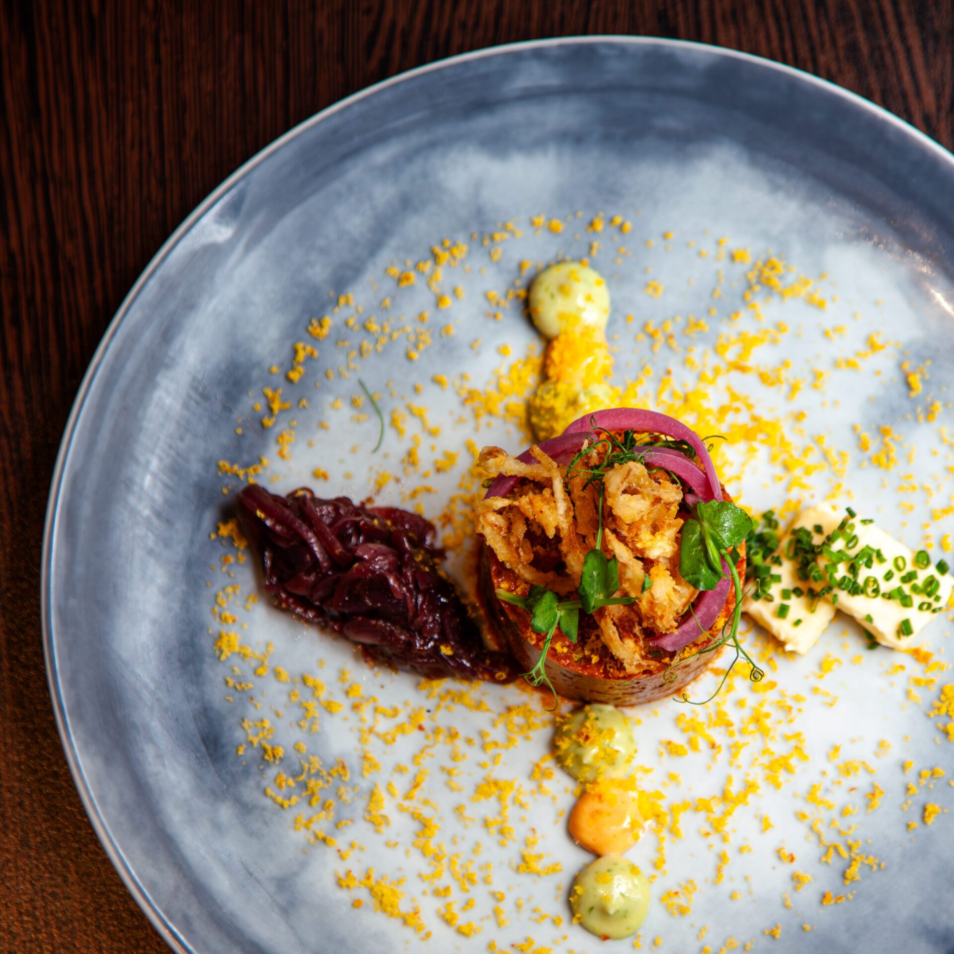 Ein klassischer Auftakt: fein geschnittenes Rindfleisch mit cremiger Schnittlauchcreme, würziger Sriracha-Mayonnaise und süß-sauren Zwiebelnoten – serviert mit Butter und Toast.
