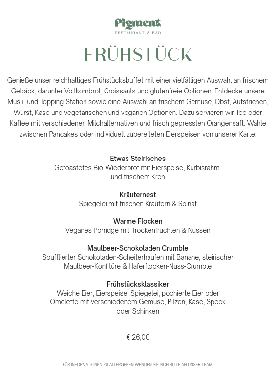 Von ofenfrischem Gebäck – inklusive Vollkorn- und glutenfreier Optionen – über hausgemachte Aufstriche, frisches Obst und Gemüse bis hin zu Müsli- und Topping-Stationen ist alles dabei. Wähle zwischen vegetarischen, veganen oder klassischen Frühstücksgerichten – und genieße dazu frisch gepressten Orangensaft, duftenden Kaffee mit verschiedenen Milchalternativen oder eine feine Teespezialität.
