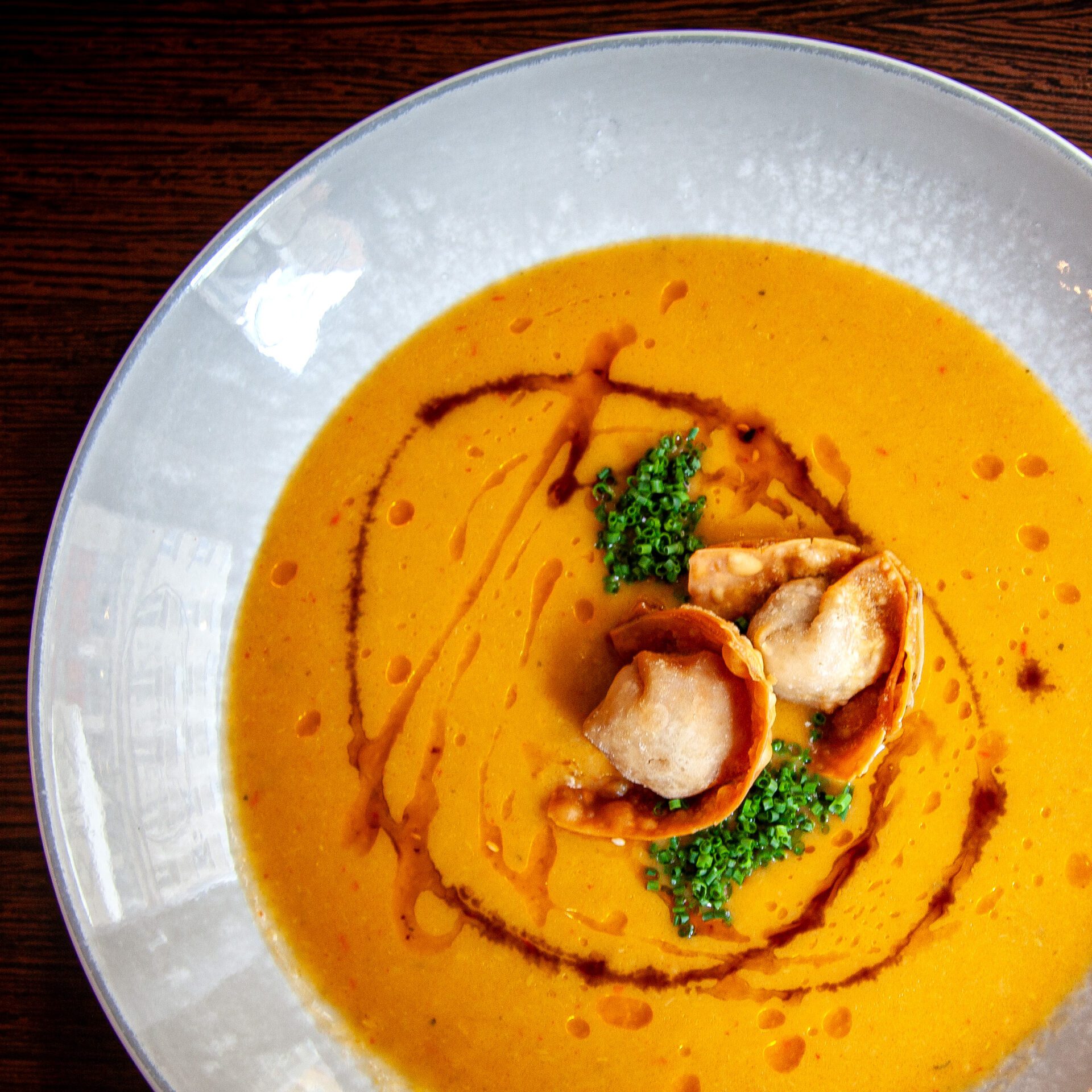 Als Zwischengang sorgt eine aromatische Gemüsesuppe der Saison mit Gemüse Wan Tan für wohlige Wärme und feinen Geschmack.