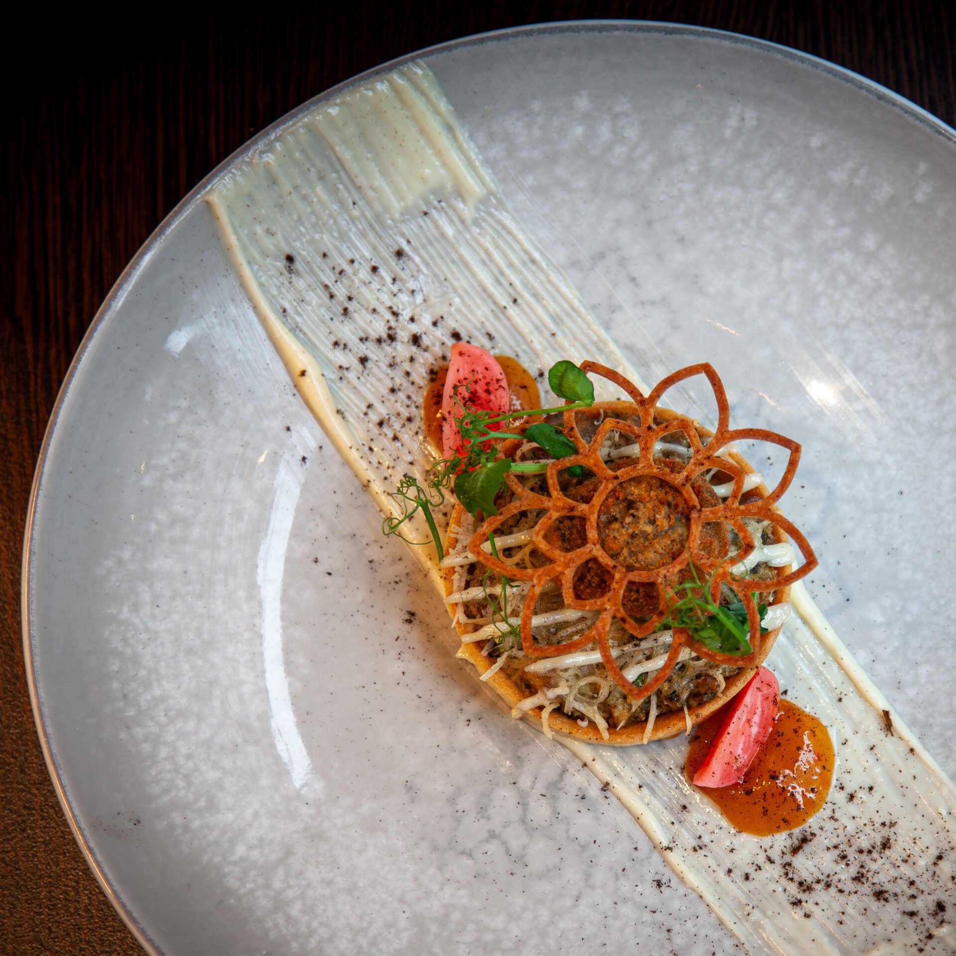 Zum Auftakt erwartet Sie eine ofenfrische Pilztartelette, mit Käse gratiniert und verfeinert mit Steinpilzmayonnaise, Mango-Relish und feinem Pilzcrumble – oder alternativ ein Veggie Tatar mit mediterranem Gemüse, Schnittlauchcreme, Sriracha-Mayonnaise und Buttertoast.