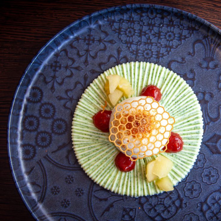 Ein erfrischendes Finale: luftiges Apfelmousse mit Joghurt, knusprigem Krokant, süßem Erdbeergel, Honighippe und frischer Minze – ein Dessert, das Leichtigkeit und Genuss verbindet.