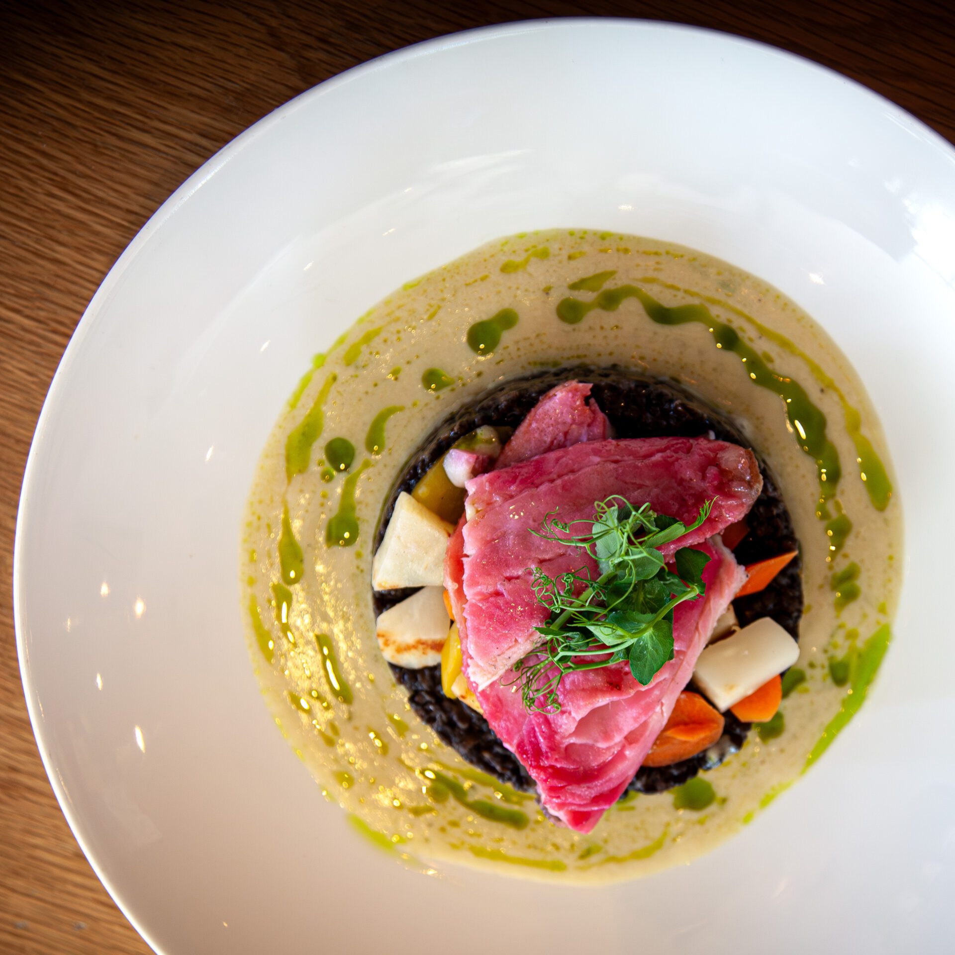 Zart mariniert und perfekt gebraten, serviert mit Belugalinsen, Wurzelgemüse, Beurre Blanc und Kräuteröl – ein leichter Hauptgang mit fein ausbalancierten Aromen.