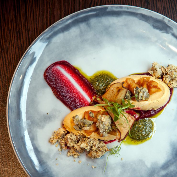 Ein feines Zusammenspiel aus cremigem Ziegenkäse, erdiger Rote-Rüben-Creme und Walnuss-Kräuter-Granola, abgerundet durch fruchtiges Apfel-Chutney, Birnen-Chip und Gartenpesto – ein eleganter Auftakt voller Kontraste.