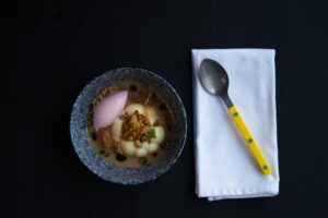 Dieses Gericht ist eine Hommage an Ruhe und Sorgfalt. Das Bio-Ei wird über Stunden sanft gegart, bis Eigelb und Eiweiß eine flaumige, cremige Konsistenz erreichen. Samtiges Trüffel-Püree legt sich weich an das Ei, während junger Spinat und Petersilienwurzel eine feinwürzige Erdigkeit einbringen. Ein Gang, der leise beginnt und lange nachklingt.