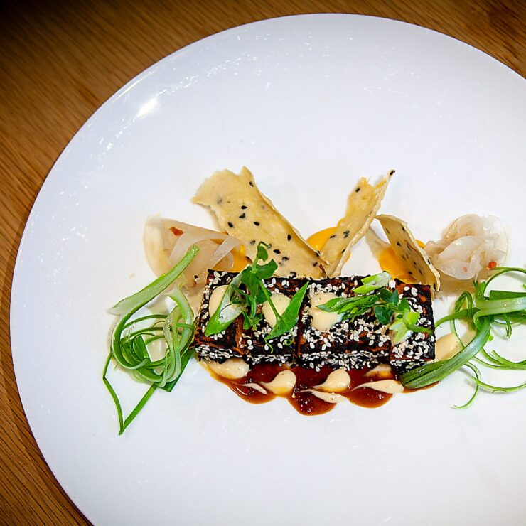 Freuen Sie sich auf eine abwechslungsreiche Auswahl an Gerichten wie Süßkartoffel Tataki mit Miso Mayo, hausgemachte Udon Nudeln mit Erdnusssauce, einen feinen Erbsen Flan oder die vegetarische Kraut Roulade – alles inspiriert von regionalen Zutaten und mit viel Liebe zum Detail zubereitet.