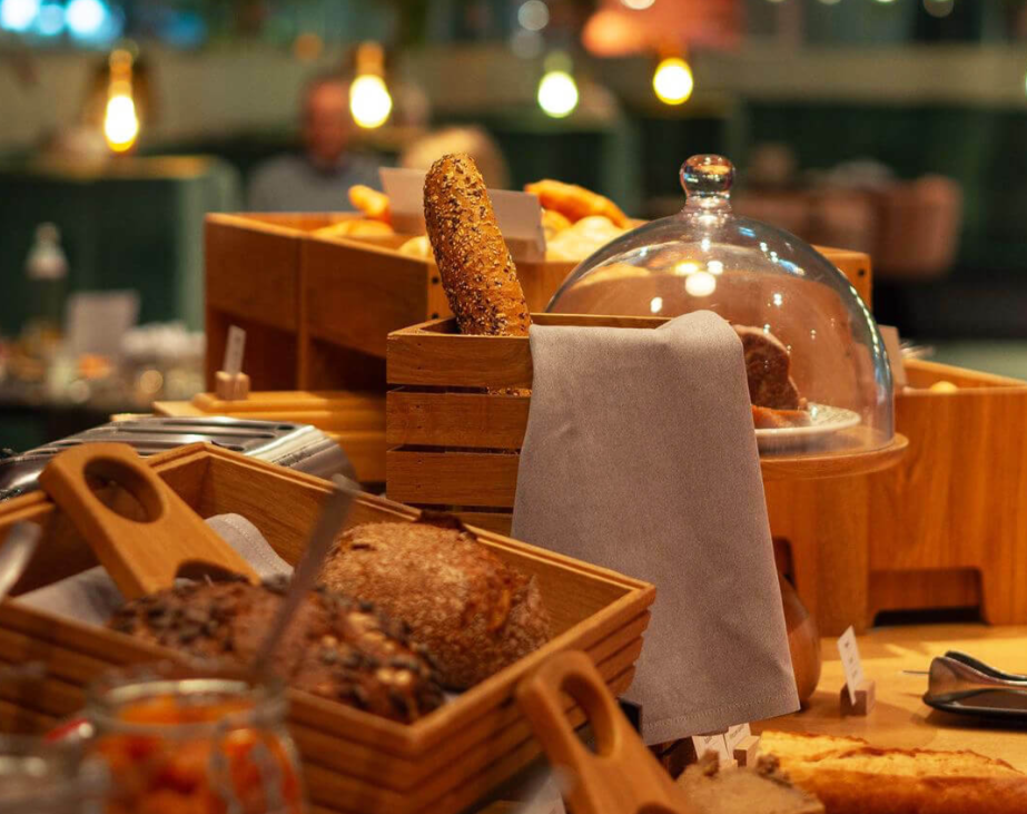 Das Buffet bietet alles, was ein ausgewogenes Frühstück braucht: ofenfrisches Gebäck, darunter auch Vollkorn- und glutenfreie Optionen, hausgemachte Aufstriche, frisches Obst und Gemüse sowie Müsli- und Topping-Stationen. Dazu kommen frisch gepresster Orangensaft, aromatischer Kaffee mit verschiedenen Milchalternativen und feine Teespezialitäten. Wer sich bewusst ernährt, findet hier ebenso passende Optionen wie alle, die es klassisch mögen.
