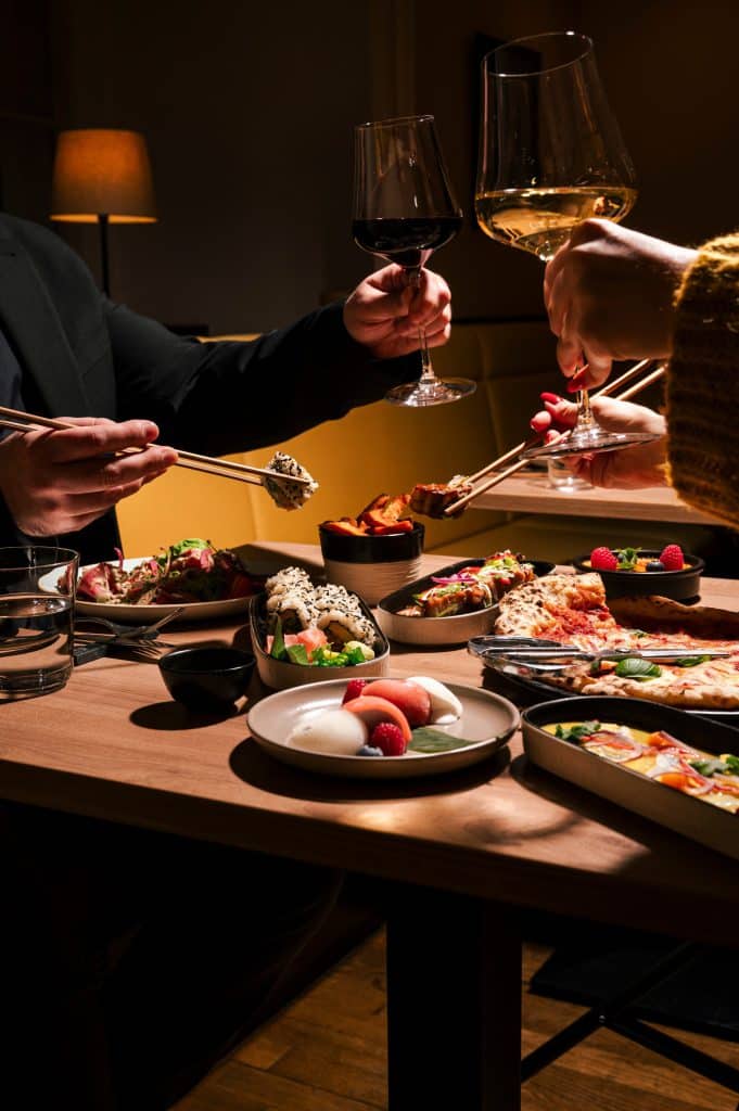 Die Reise startet mit kleinen Vorspeisen wie knusprigem Pizzabrot mit Rosmarin, Pimientos de Padrón oder gemischten Oliven und führt weiter zu kalten und warmen Klassikern mit modernem Twist. Egg Benedict mit Brioche, Prosciutto, Avocado und hausgemachter Yuzu-Hollandaise trifft auf feine Sashimi- und Ceviche-Variationen, Beef Tataki, Vitello Forello oder knusprigen Sushireis mit Fisch-Tatar. Auch Sushi-Fans kommen voll auf ihre Kosten – von kreativ zusammengestellten Maki-Variationen bis zu Signature Rolls, darunter auch vegane Optionen.