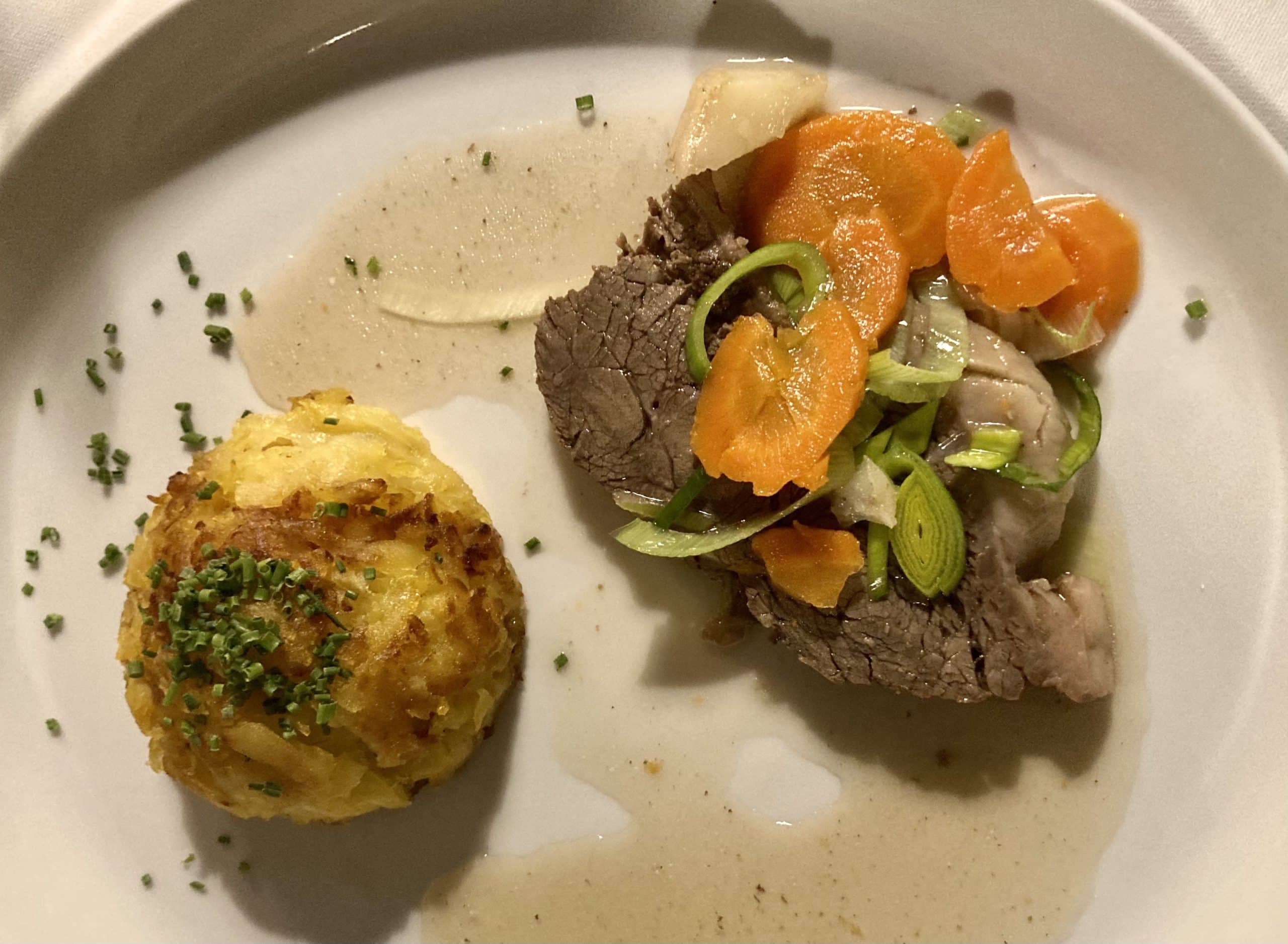 Der Alphart entkorkt, kurz darauf werden auch die Hauptspeisen aufgetragen. Tafelspitz mit klassischen Beilagen für den Obmann. Für mich: Gebackenes Hirn mit Erdäpfel-Vogerl-Salat. Beides ohne „Wenn und Tadel“ (Geschwister von “Wenn und Aber”). Aufgewachsen ist Dobcak mit Hausmannskost und Restlessen. Seine Eltern führten ein Hotel im Salzburger Hochgebirge. “Wer weiß, wie mühsam es ist, dort Lebensmittel hinauf zu transportieren, der wird kein Essen wegschmeißen. So halte ich das auch“.