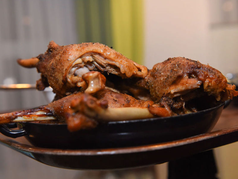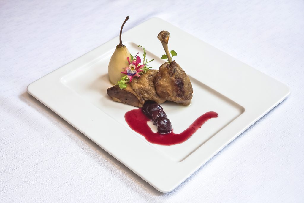 Ein Menü, das die herbstliche Jahreszeit mit ihren warmen Aromen und vertrauten Klassikern feiert. Traditionell, klar und mit Liebe zum Detail zubereitet – so zeigt sich die Gans von ihrer besten Seite. Beginnend mit einer fein abgeschmeckte Gänseleber, als kleine Praline serviert. Dazu Apfel-Chutney, frisch getoastete Brioche und zarter Vogerlsalat – eine ausgewogene Kombination aus Süße, Säure und Schmelz. Danach eine kräftige, cremige Suppe aus Gans, verfeinert mit Wurzelgemüse und einem feinen Bröselknödel. Ein wärmender Auftakt mit klarer Linie und vollmundigem Geschmack. Den Hauptgang macht eine sanft gegarte Gänsekeule mit aromatischem Sternanis-Rotkraut, Birnen-Grießknödel und kräftiger Maronijus. Cremige Moccamousse mit feinem Kaffeearoma, serviert mit leicht säuerlichem Himbeerröster. Ein ruhiger, ausgewogener Abschluss des Menüs.