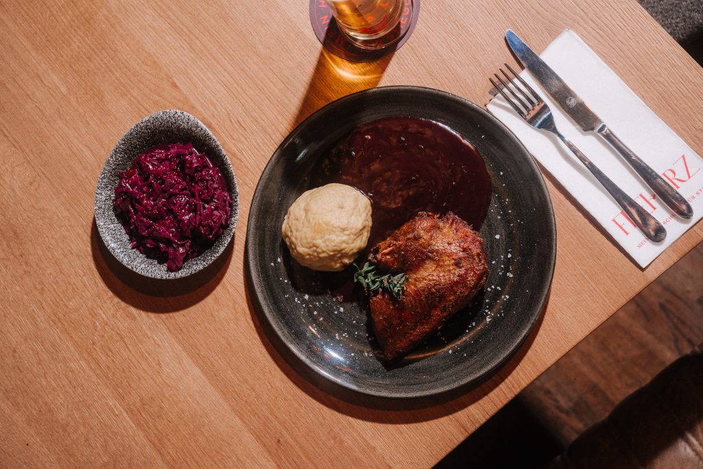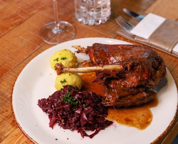 Im STUWER – Neues Wiener Beisl wird die Ganslzeit zu einem kulinarischen Highlight. Auf der herbstlichen Karte findet sich ein fein abgestimmtes 3-Gang-Ganslmenü: Zur Einstimmung gibt es wahlweise eine herzhafte Ganslsuppe mit Bröselknödel, Gänseklein und Gemüse oder eine klare Bouillon vom österreichischen Bio-Rind mit Grießnockerl. Als Hauptgang wartet ein sous-vide gegartes ¼ Gansl, serviert mit Erdäpfelknödel, Quitten-Rotkraut und aromatischem Saftl. Den süßen Abschluss bildet eine pochierte Birne mit Maronimousse, Vanillehippe und karamellisierten Haselnüssen – ein Dessert, das herbstliche Eleganz auf den Teller bringt. Wer möchte, kann das Menü mit einer abgestimmten Weinbegleitung abrunden und so das volle Genussprogramm erleben.