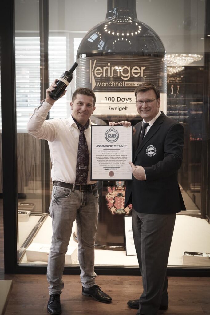Robert Keringers Vision wurde 2017 Realität: die größte Weinflasche aus Glas erreichte mit 1.590 Litern seines preisgekrönten 100 Days Zweigelt 2015 einen offiziellen Guinness Weltrekord. Das imposante Glasgefäß – 3 Meter hoch, 770 kg schwer mit einem Durchmesser von 1,08 Metern – fand seinen Platz im Asia-Restaurant Engel Wang Fu in Lustenau/Vorarlberg, wo es in einer eigens errichteten klimatisierten Kammer bei konstanten 16°C lagerte.
