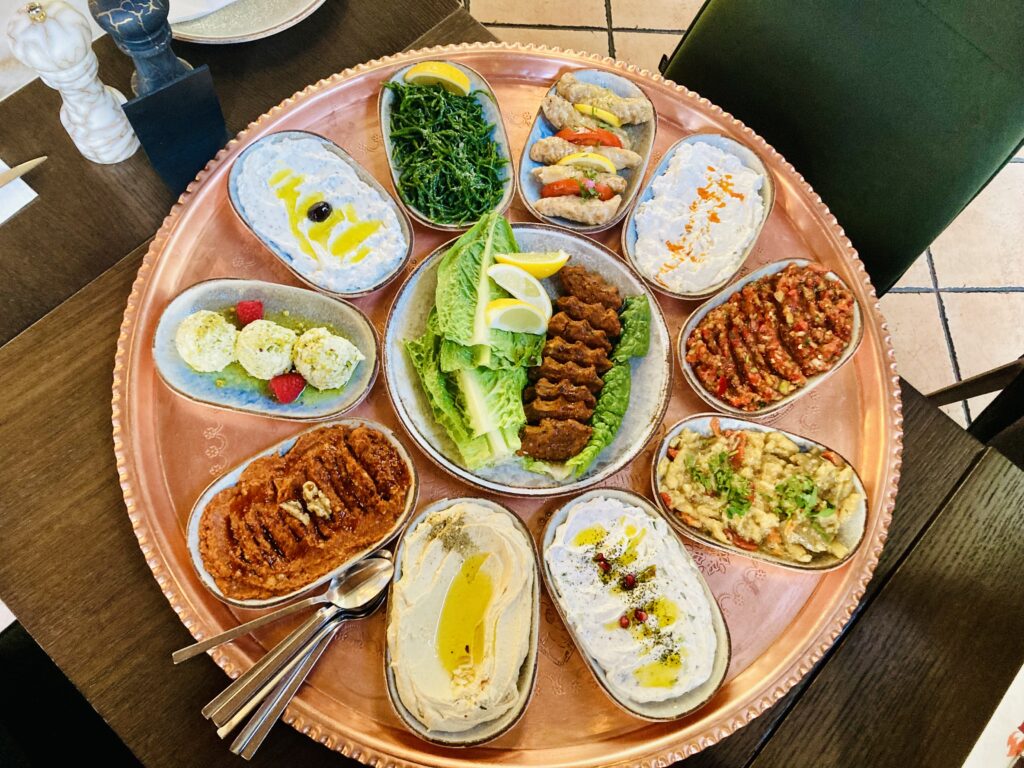 Zum Auftakt die Vorspeisen, ganze 24 stehen zur Wahl. Wir konzentrieren uns auf die kalten, eindrucksvoll präsentiert auf einer große Platte. Darunter Klassiker mit gehackten Paradeisern, mehrere Varianten mit Melanzani (sehr gut: die geräucherte Auberginencreme) sowie Joghurtgerichte wie cremiger Haydari mit frischer Minze. Dazu kommt knusprig-fluffiges Fladenbrot. Alles frisch, geschmackvoll und liebevoll präsentiert, insgesamt, auch dem australischen Gaumen geschuldet, eher zurückhaltend gewürzt.