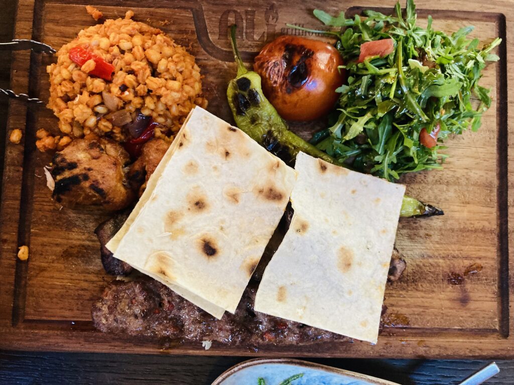 Dreierlei vom Spieß – Lamm, Lammfaschiertes und Huhn ist schon einmal fantastisch: so rauchig, aromatisch, gleichzeitig saftig kann Gegrilltes sein. Liegt allerdings auch an der herausragenden Fleischqualität. Wie tomatisierter Reis sieht die Beilage aus, entpuppt sich jedoch als Weizengrüzte, besser bekannt als Bulgur.