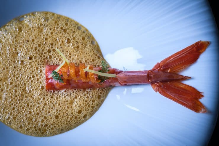 Schon der Auftakt hat es in sich: „Die Gewürzflotte“ erzählt von Österreichs einstigem Handelsdrang – interpretiert als feurige Liaison von Ingwer, Kardamom, Kimchi und Sellerieröllchen. Doch das wahre Signature-Dish trägt den Namen des Hauses: „Goldene Birn“ – ein opulentes Rendezvous aus Gänseleber, Carabinero, Oxalis und Krustentierschaum.