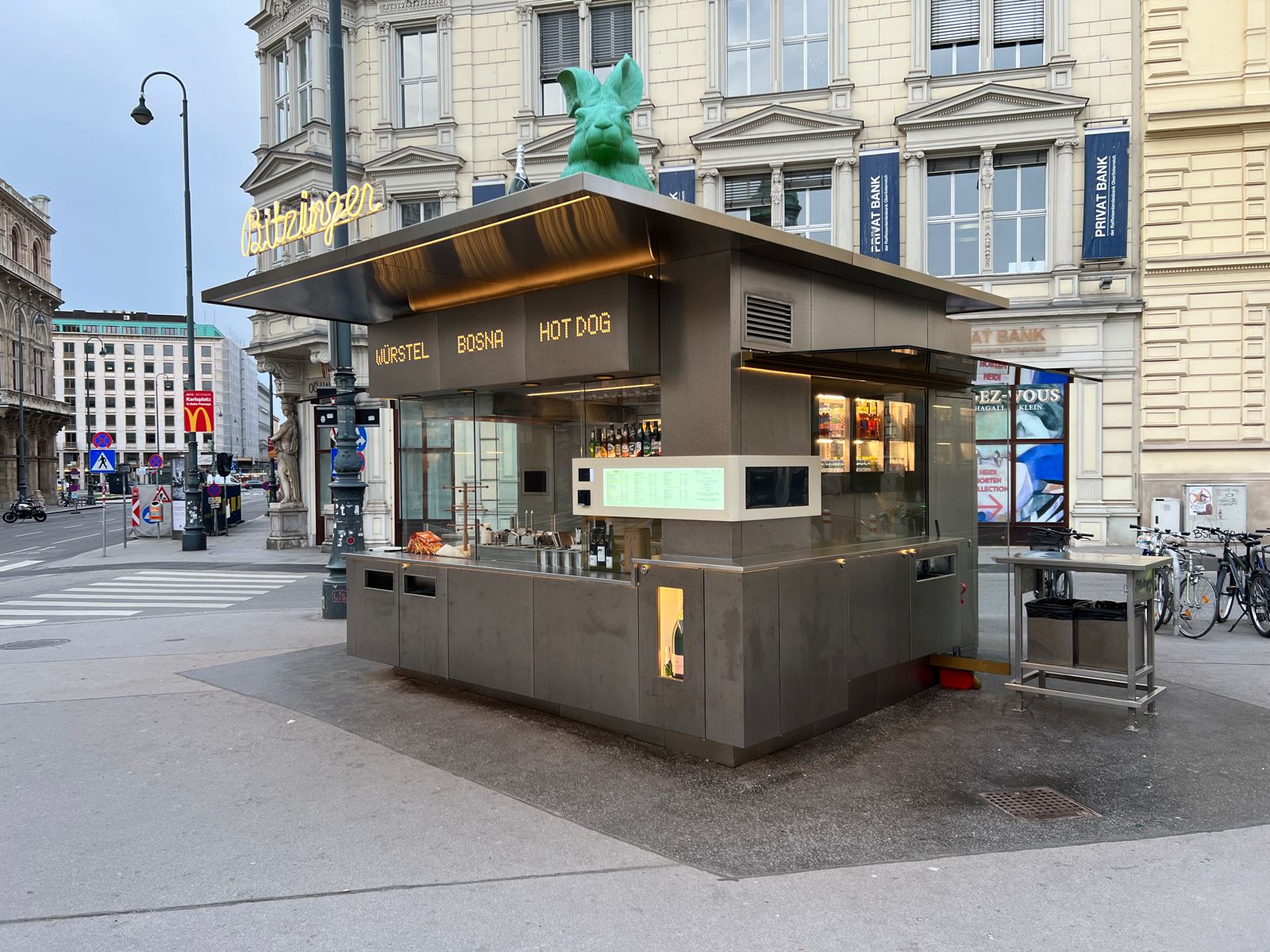 Vor 25 Jahren ergab sich für den Inhaber die Möglichkeit, einen Standplatz bei der Albertina zu erwerben. 2008 wurde der neu renovierte Würstelstand eröffnet, der sich durch modernes Design von anderen Ständen abhebt. „Wir wollten es anders machen“, erklärt er. Die Zusammenarbeit mit einer jungen Architektin führte zu einem frischen Konzept, das den traditionellen Charme eines Würstelstands bewahrt und gleichzeitig modern wirkt.