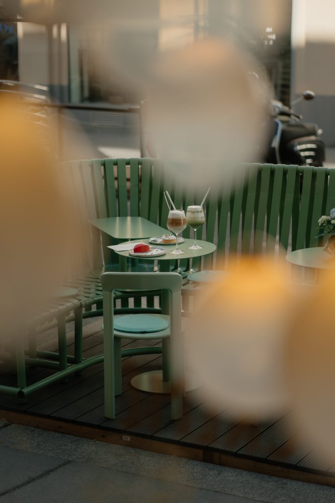 Der neu gestaltete Schanigarten ist das Herzstück des Sommers in der Kettenbrückengasse und bietet eine willkommene Ruheinsel mitten im geschäftigen Viertel. Großteils im Schatten gelegen, lädt der liebevoll gestaltete Außenbereich dazu ein, den Alltag für eine Weile hinter sich zu lassen und in entspannter Atmosphäre die feine Auswahl von La Petite Crème de la Crème zu genießen. Ob beim Frühstück in der milden Morgensonne, einem gemütlichen Nachmittag mit Cappuccino oder einem kühlen Drink an warmen Sommertagen – hier findet jeder Gast seinen perfekten Platz zum Abschalten und Verweilen. Das durchdachte Design mit bequemen Sitzgelegenheiten, grünen Pflanzenarrangements und warmen Lichtelementen schafft eine harmonische Verbindung von Eleganz und Gemütlichkeit.