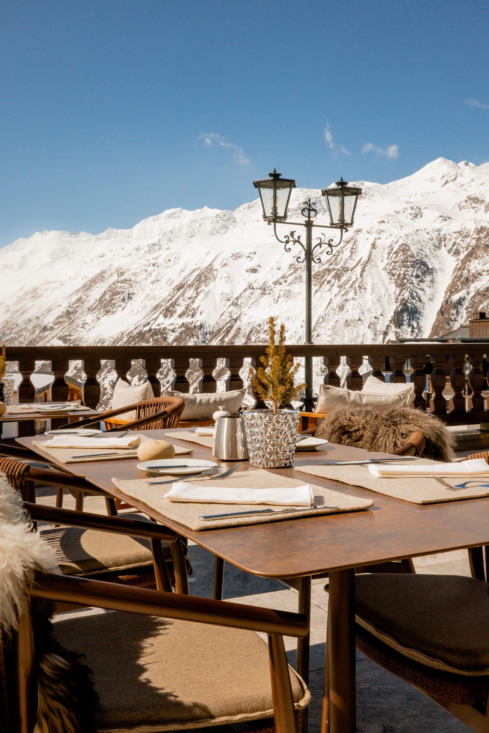 Die Mittagskarte bietet zudem Tiroler Schmankerl sowie moderne Kreationen und lädt dazu ein, bei Sonnenschein auf der Panoramaterrasse mit Blick auf die schneebedeckten Ötztaler Alpengipfel zu genießen.