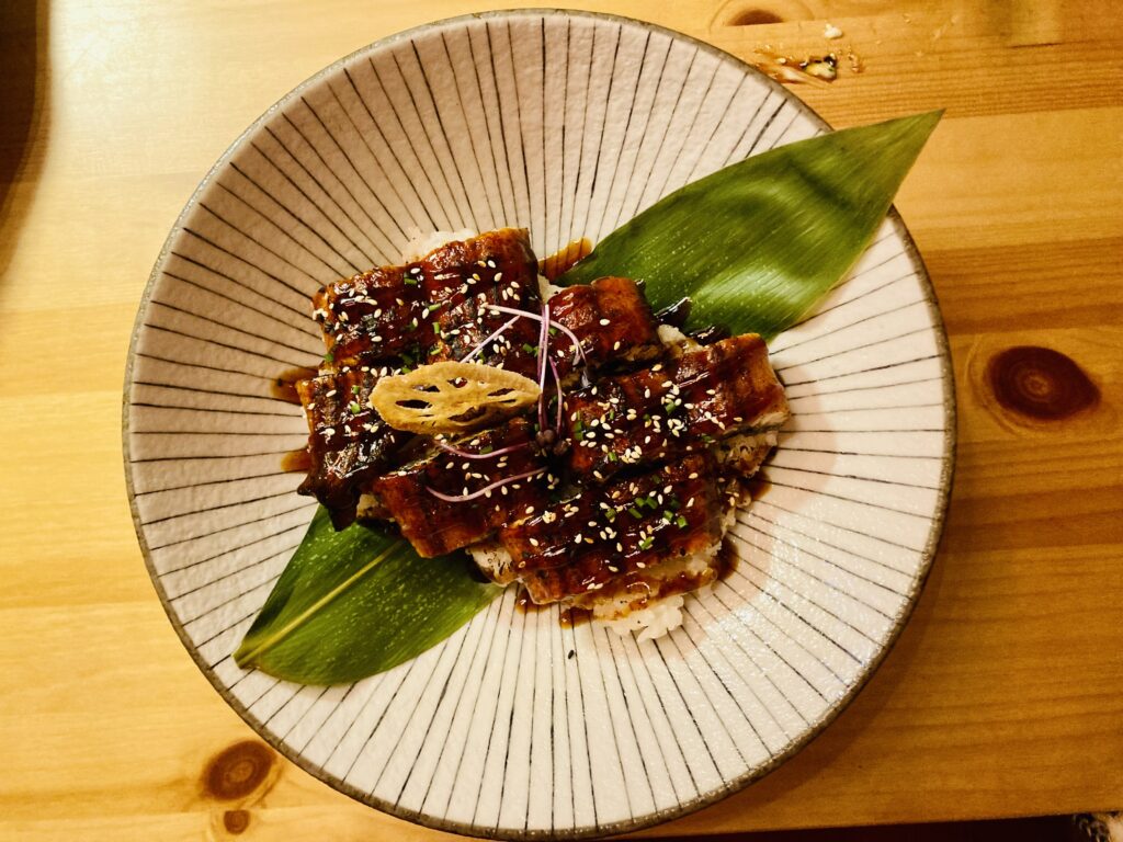 Der erste Hasuptgang, das Wok-Gericht “Huhn loves Pepper” überzeugt leider gar nicht. Keine Schärfe, wenig Geschmack, klebrige Sauce. Wie auch der zweite Hauptgang, wo der gegrillte Aal in einer allzu süßen, klebrigen Teriaki-Sauce ertrinkt.