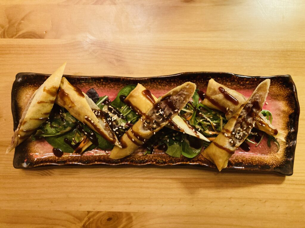 Wir starten mit Frühlingsrollen. Der Teig ist knusprig, die Krautfüllung knackig, der leicht säuerlich marinierte Salat passt gut. Garniert wird hier prinzipiell (fast) alles mit Teriyaki-Sauce, aber dazu etwas später. Weiter geht es mit gemischten Vorspeisen, “Chef’s special assorted Sushi platte” betitelt (25 Euro/Person). Rolls, süß-sauer marinierter Lachs, 3 Sushi und Edame.