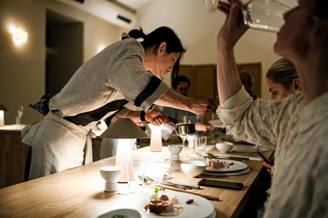 Hinter dem Konzept stehen Jaeho Jung und Jungyun Kim– ein Ehepaar, das sich mit Addiert nicht einfach einen Traum erfüllt, sondern ein sehr klares Zeichen setzt. Er: ausgebildeter Koch, der weltweit Erfahrungen gesammelt hat, auch im renommierten Steirereck in Wien, vor Jahren auch im koreanischen Fernsehen zu sehen, als Teilnehmer bei MasterChef. Sie: Gastgeberin, Gestalterin, Stimme im Hintergrund. Und gelegentlich auch in der Küche, wo sie beim Finalisieren mancher Gänge assistiert.