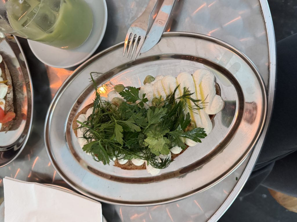 Wir haben uns an einem Vormittag einen Platz im Lokal gesucht und uns durch die Karte probiert. Besonders empfehlen können wir das Ricotta-Brot (8,50 €): Ricotta und Olivenöl bilden die Basis, dazu kommen gegrillte Erbsen, frische Kräuter und ein Hauch von gegrillter Zitrone – serviert auf kräftigem Sauerteigbrot. Ein Gericht, das schlicht wirkt, aber mit jedem Bissen überrascht.