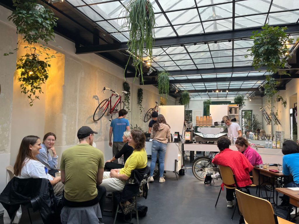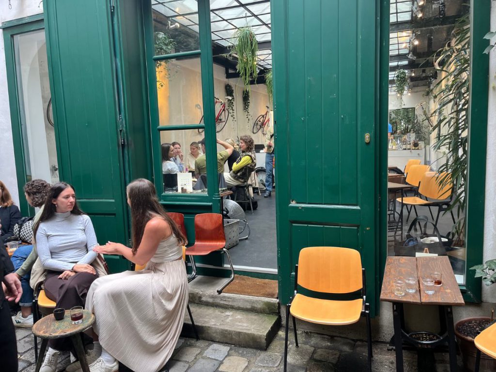 Schon nach kurzer Zeit hat sich eine bunte Gästestruktur etabliert: Tourist:innen, Nachbar:innen, Pensionist:innen und Studierende teilen sich den Raum. Raoul legt Wert darauf, dass alle Platz finden. Mitunter setzt er Gäste an denselben Tisch – „wie in Barcelona“, sagt er. Wichtig ist ihm nur, dass die Durchgangssituation zwischen Mariahilfer Straße und Windmühlgasse nicht blockiert wird. So wird das Café auch Teil des lebendigen Flusses im Raimundhof.