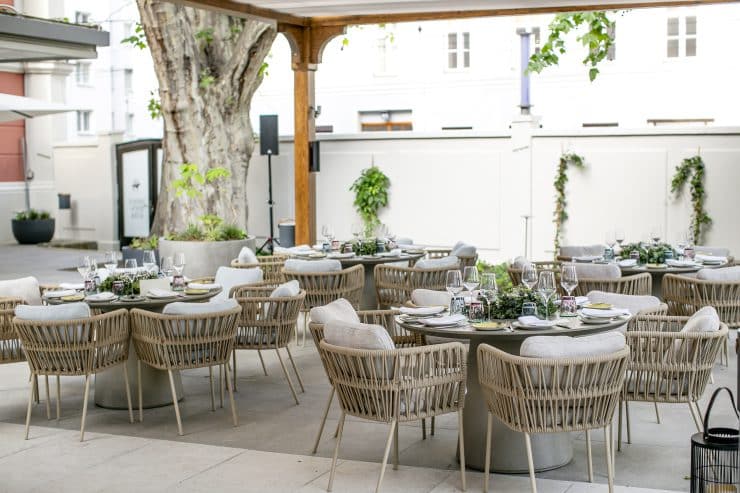 Besonders ist auch der große Garten des neuen Hotels. Der ehemalige Obstgarten Kaiser Franz Josephs I., der sich hinter der prunkvollen Originalfassade der früheren k.u.k. Militärreitschule offenbart, lädt ab sofort mit Garten-Terrasse und Freiluft-Bar und -Küche zu Barbecues und Drinks.