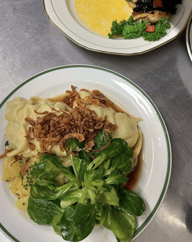 Die Speisekarte des Rosi macht eines sofort klar: Hier wird experimentiert – und mit Geschmack gewonnen. „Es gibt keine klassische Wirtshausküche bei uns“, erklärt Till. Stattdessen locken kreative vegetarische Gerichte wie Sellerie-Blauschimmelkäse-Churros oder Castelfranco-Röllchen in Meyer-Zitronen-Marinade. „Als Schwabe musste ich aber natürlich Maultaschen auf die Karte setzen“, fügt er schmunzelnd hinzu. Und diese stehen nicht nur als Symbol für Kindheitserinnerungen, sondern auch für das Herzstück des Lokals: Wohlfühlen wie bei Oma daheim.