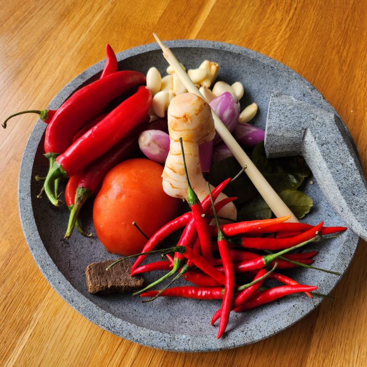 Die indonesische Küche zeichnet sich vor allem durch enorme Geschmacksvielfalt und Exotik aus – aber auch durch Schärfe. Die Basis bildet „Bumbu“. Das sind Gewürzpasten in verschiedenen Farben, welche wir selbst aus frischen Zutaten herstellen. Die Herstellung ist sehr langwierig und erfordert doch ein großes Wissen über die die indonesische Küche. Indonesien ist der viert-bevölkerungsreichste Staat der Erde und erstreckt sich auf 17.500 Inseln. Es ist unmöglich, alle regionalen kulinarischen Varianten abzubilden. In unserem Restaurant soll man einen Eindruck über einzelne Regionen (Bali, West Java, Sumatra, etc.) bekommen.