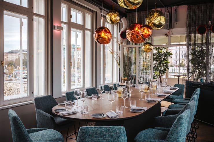 Das Restaurant erstreckt sich über drei Ebenen und bietet eine außergewöhnliche Atmosphäre zum Wohlfühlen. Im Erdgeschoss beeindruckt eine offene Küche sowie eine Bar mit einer Vitrine für Tapas-Spezialitäten und frischen Fisch. Im ersten Stock erwartet die Gäste eine gesellige Bar sowie private Dining-Räume für besondere Anlässe. Der oberste Stock bietet einen exklusiven Raum mit Blick auf den Ringturm und die Stadt.