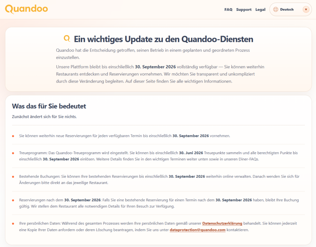 Am 1. Oktober 2026 werden die Verbraucherdienste von Quandoo eingestellt. Die Plattform bleibt zwar noch eingeschränkt als statische Informationsseite verfügbar, operative Funktionen wie Buchungen oder Kontozugriffe entfallen jedoch vollständig. Mit dem 31. Dezember 2026 erfolgt schließlich die komplette Abschaltung der gesamten Infrastruktur.