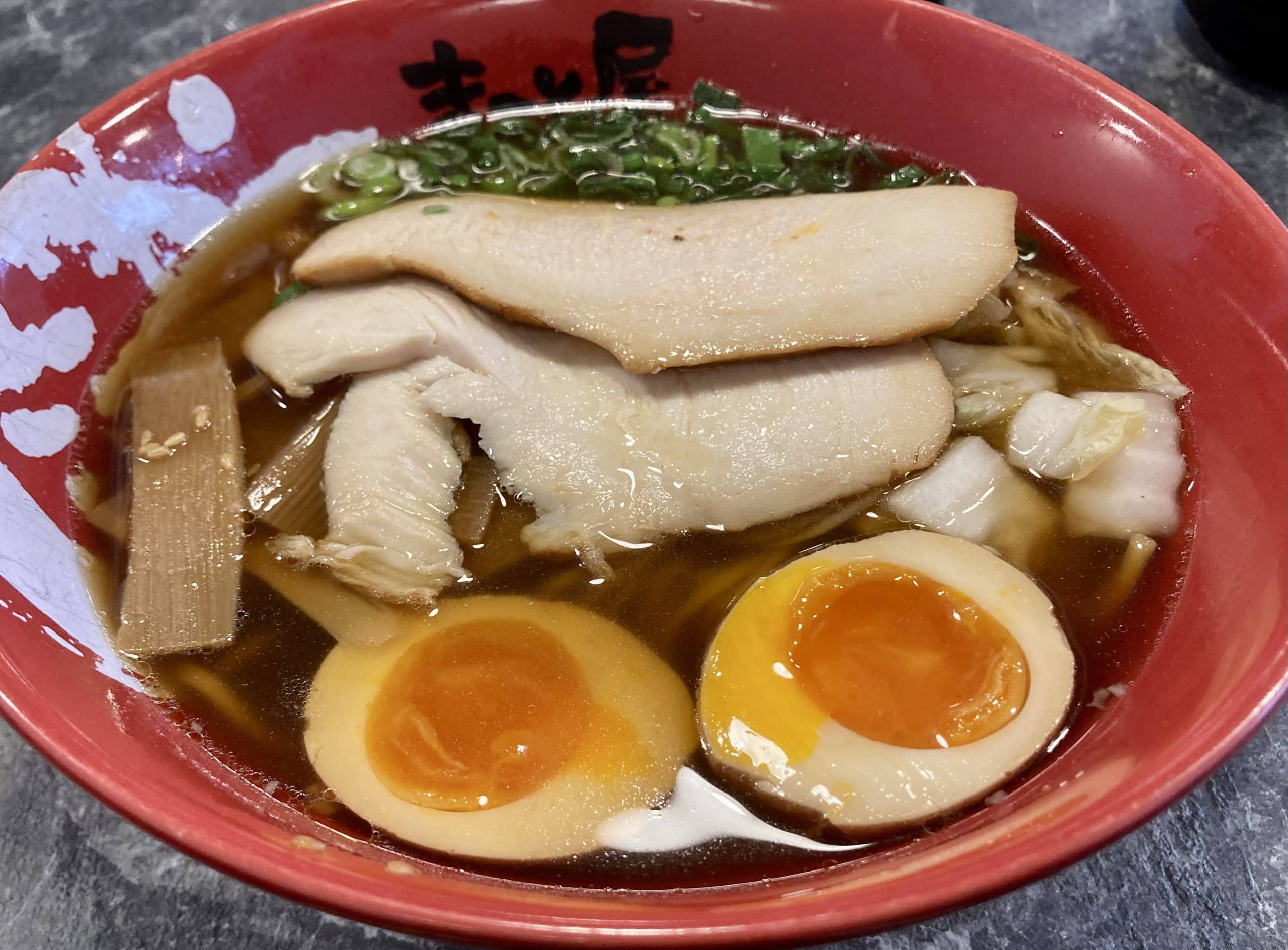 Die Hühnerknochenbrühe (15,50€) gelingt insgesamt besser. Klarer Geschmack, die Weizennudeln bissfest, die Hühnerbrust erfreulich zart und doch geschmackvoll. Einlagen: Dem Chinakohl fehlt es an Frische, das Ei hingegen gerät: perfekt.
