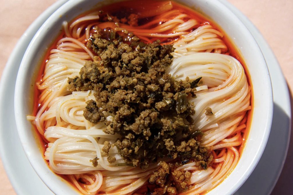 Mit Dan Dan nämlich, “Pikant gewürzte gekochte Nudeln Sichuan-Art garniert mit faschiertem Schweinefleischein”, einLieblingsgericht des Autors. Wobei die scharfe Brühe der Aromatisierung der dünnen Nudeln und des Faschierten dient. Sie muss/sollte also nicht gegessen werden.