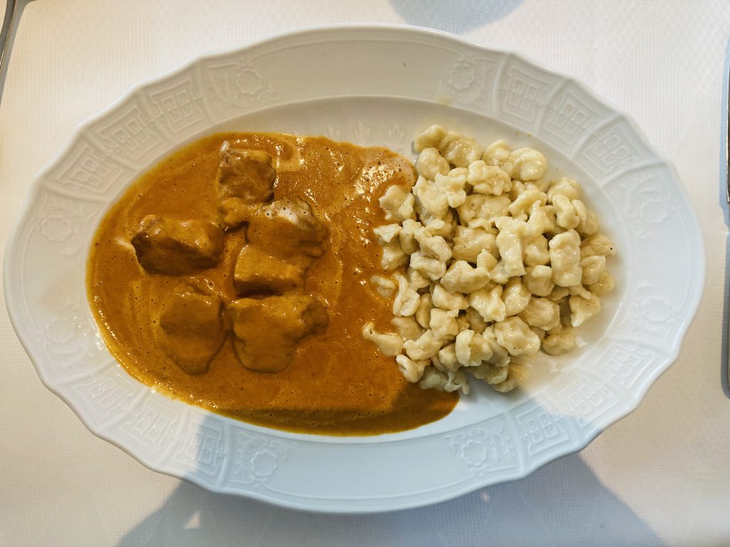 Weiter geht’s mit Wagramer Lachsforelle. Lauwarm angemacht in einer leicht asiatisch angewürzten Brühe. Fein abgeschmeckt, erfrischend, elegant (19 €) Alsdann das schulmäßig sämige, mollige paprizierte Kalbsrahmgulasch mit Spätzle an den Tisch kommt (24 €).