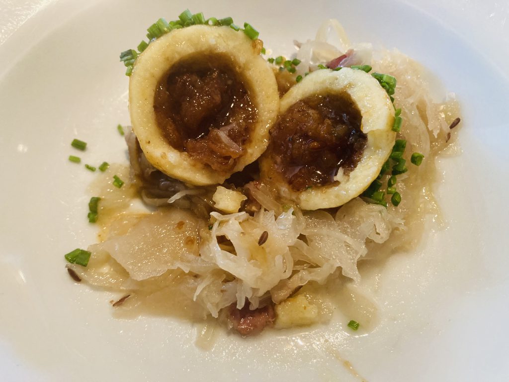 Als, naja, Zwischengang – heute teste ich ausnahmsweise ein mal alleine – nehm ich noch ein Glas Klostersatz, gefolgt von einem säumigen Grammelknödel mit lauwarmen Kraut. Der Teig: himmlisch. Die Grammeln: göttlich (2 Stk. 11 €).