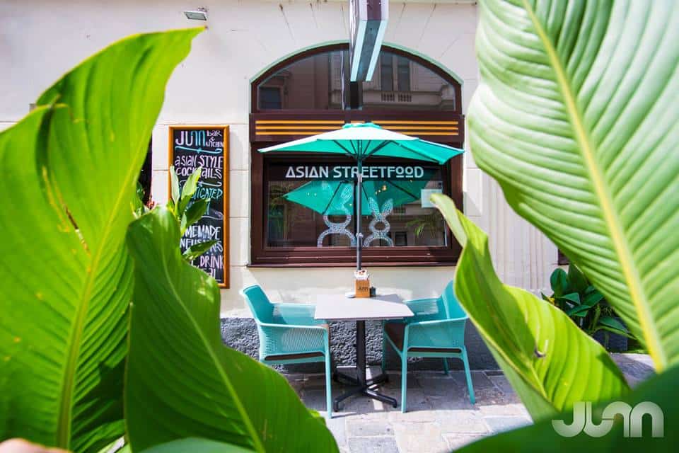 Bis der Business Lunch serviert wird, bleibt etwas Zeit um die hippe Lokalität zu erkunden. Der große Gastgarten ist mit gemütlichen Lounge Möbeln ausgestattet, die in der Mittagspause für die wohlverdiente Auszeit des zumeist hektischen Arbeitsalltags sorgen. Der gesamte Außenbereich ist mit großen Sonnenschirme überdacht und so ist auch an heißen Tagen für angenehmen Schatten gesorgt. Die Atmosphäre im Gastgarten des Junns ist etwas ganz Besonderes – die Gäste sowie das Personal sind entspannt und es herrscht keine Hektik. Zu dieser Stimmung tragen bestimmt auch die schön arrangierten Planzen und Palmen bei, die überall im Gastgarten zu finden sind.