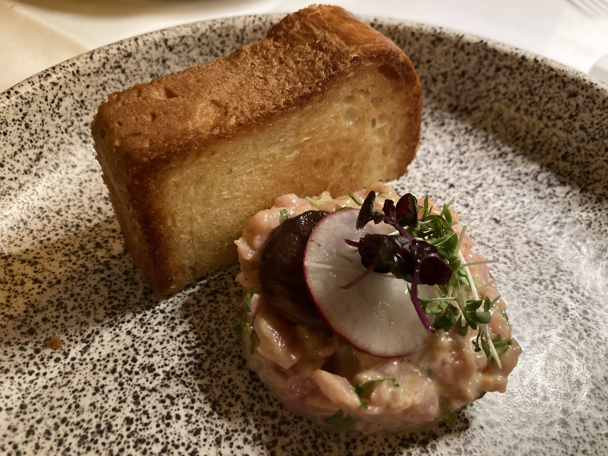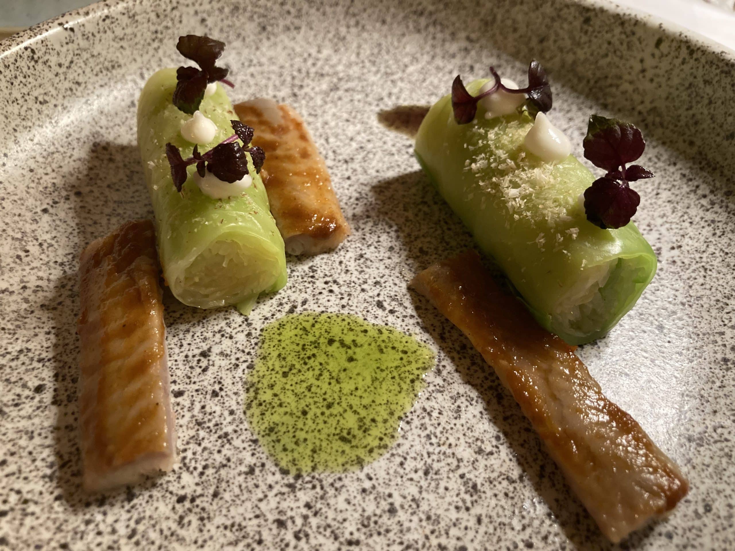 Dem 6-gängigen Tasting-Menü wird wahlweise Wein- oder Saftbegleitung (85 bzw. 65 €) zur Seite gestellt. Wir wählen an diesem Tag Prickelndes. Cremant soll’s sein, später etwas Champagner. Gang 1: Das Tatar vom mit Kalb mit Hollandaise, Kerbel, Limette und Shiitake-Pilz. Fein im Geschmack, handwerklich tadellos, könnte etwas größer dimensioniert sein. Weiter geht’s mit einem frisch-fruchtig geschmortem Kürbis, gefolgt von Barbecue-Aal mit Spitzkraut, einer erfreulich gelungenen Kombination aus frisch- und rauchigen Aromaten.