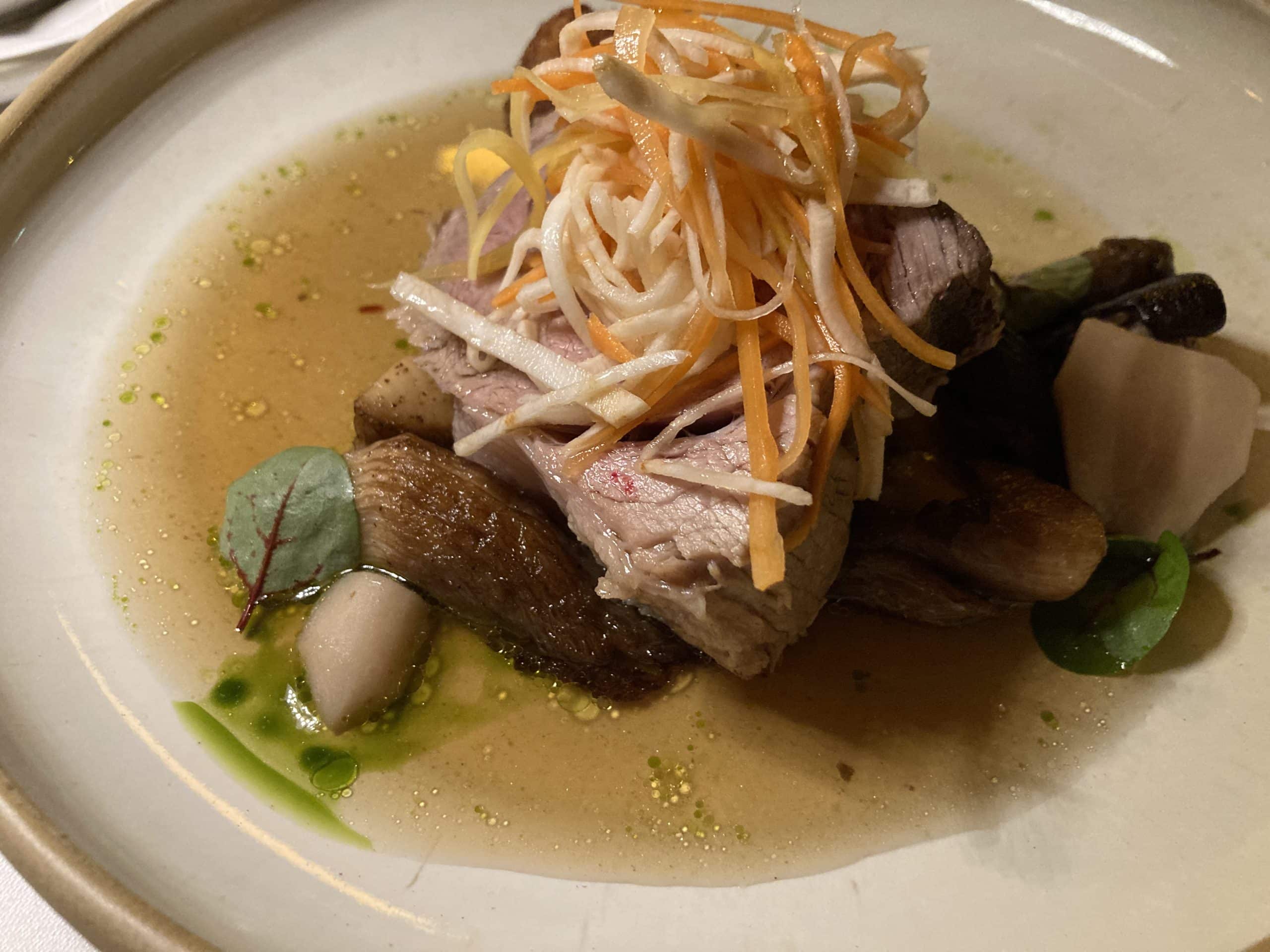 Zu den Hauptgerichten. Überzeugend: der Kabeljau in einem zarten Goldrüben-Dashi. Das gekochte Schulterscherzel ist von zartem Schmelz, der Kren auf der milden feinen Seite. Ob es hier jedoch Steinpilze und Blutwurst braucht? Als Dessert: Mille-Feuille mit Haselnuss und Vanille-Eis. Hauchzarter Blätterteig, etwas Haselnuss, etwas Eis. Sehr gelungen, hier passt wieder alles.