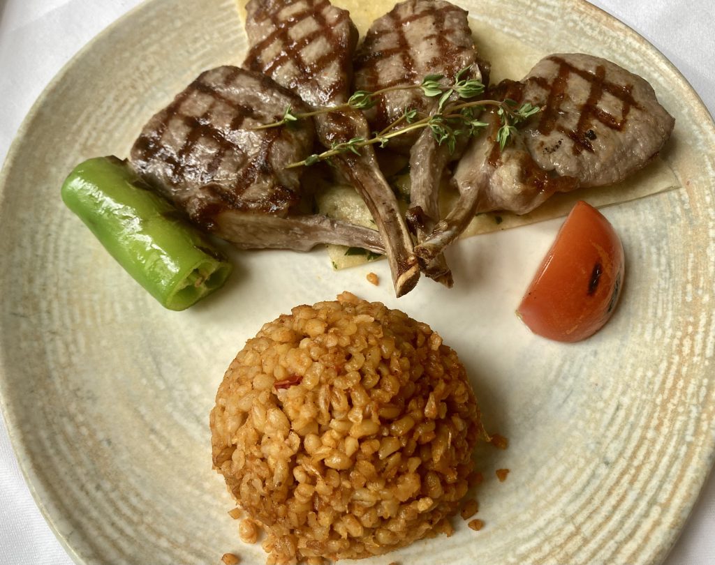 Nun aber rasch zu den Hauptgerichten. Beyti, faschiertes gegrilltes Lammfleisch in Lavasbrot mit Joghurt und tomatisiertem Bulgar geriet gelungen und eignet sich bestens, um zu teilen. (25 Euro). Auch nichts zu bekritteln gibt’s an den Lammkoteletts: zart, tadellos gegrillt (29 Euro). Dazu: Ayran. Danach: Cay. Und der ging auf’s Haus.
