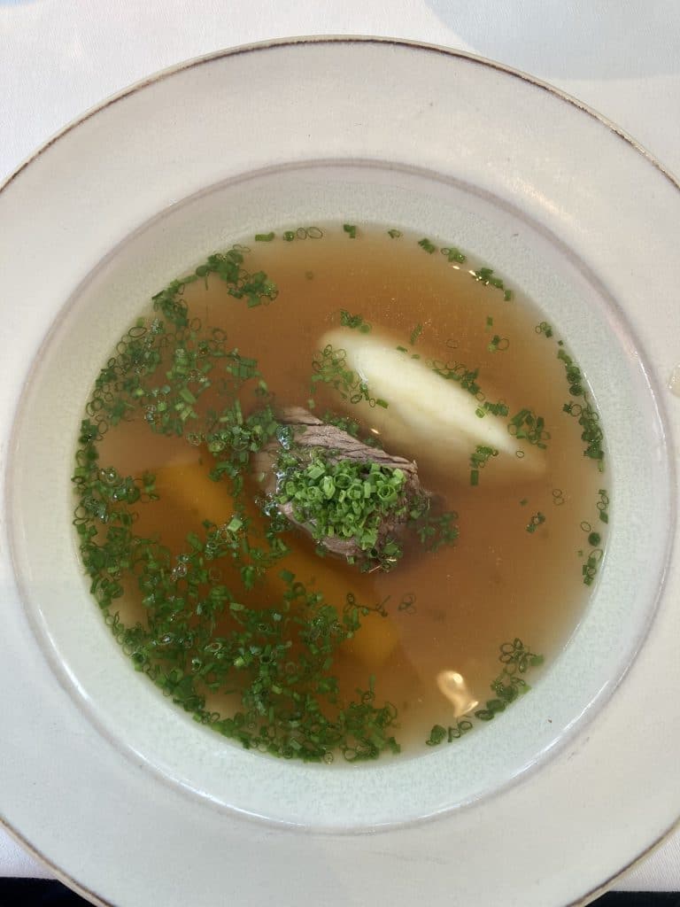 Mit einer ordentlichen Portion Schnittlauch wird eine solide, sparsam gewürzte Beinfleisch Suppe aufgetragen. Die öfter monierte lange Wartezeit ist hier, wir haben nicht mitgestoppt, gefühlsmäßig völlig in Ordnung. Wer gut essen möchte, sollte auch die Zeit dafür aufbringen.
