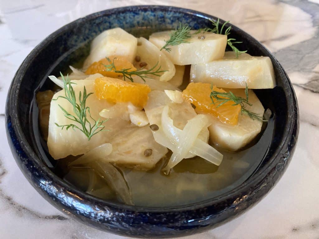 Klar, man kann auch a la Carte bestellen. Ab 2 Personen empfiehlt sich jedoch das 6-gängige Menü (49 Euro pro Person). Wird starten mit: Sellerie in Olivenöl mit Orangen. Perfekt gegart, lauwarm serviert, sensibel abgeschmeckt. Ein guter Start, der Lust auf mehr macht.