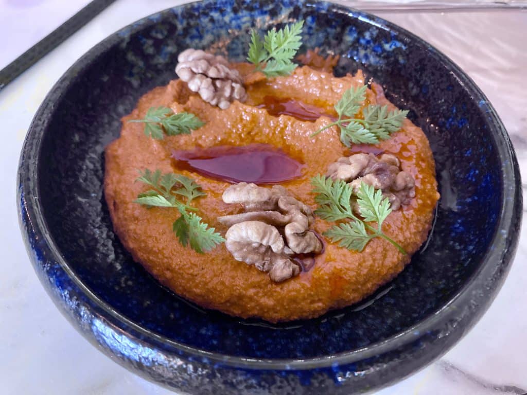 Weiter geht’s mit einer klassischen türkischen paprizierten Vorspeise, die mit hausgebackenem Pide-Brot (In Griechenland: Pisa-Brot) aus Hefeteig aufgetunkt wird.