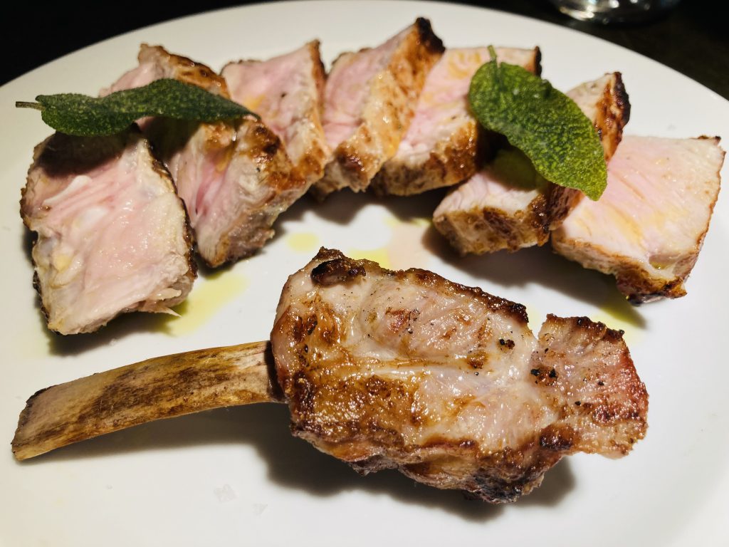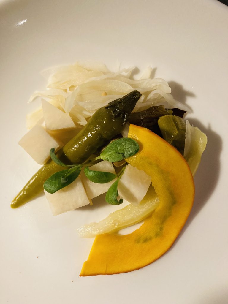 Erste Vorspeise: Alici, Chili, sizilianisches Olivenöl (siehe Titelbild). Gefolgt von eingelegtem, sauren Gemüse sowie Coppa und Schinkenspeck. Letzteres von zartem Schmelz. Dazu wird Sauerteigbrot gereicht – “nein, wir machen das Brot nicht selbst, das machen andere besser”, sagt der Küchenchef auf Nachfrage.