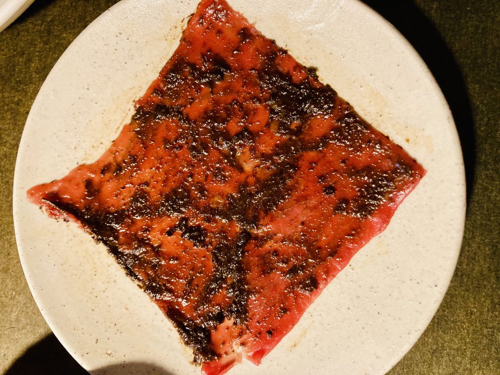 Alsdann trägt Ismael Faye “Reh und Ringlotte” auf. Geklopftes Carpaccio vom Reh, bestrichen mit schwarzem, süßlichem Knoblauch. Eine gesalzene Ringlottenpaste gibt dieser delikaten Vorspeise noch den nötigen Kick (14 Euro).