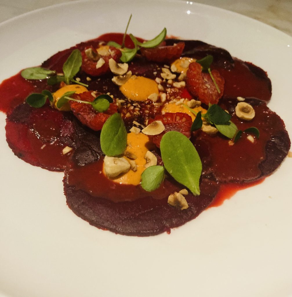 Nach Brot und Butter werden lauwarme Rote Rüben mit Himbeeren und Chili-Mayo kredenzt. Ein guter Start.