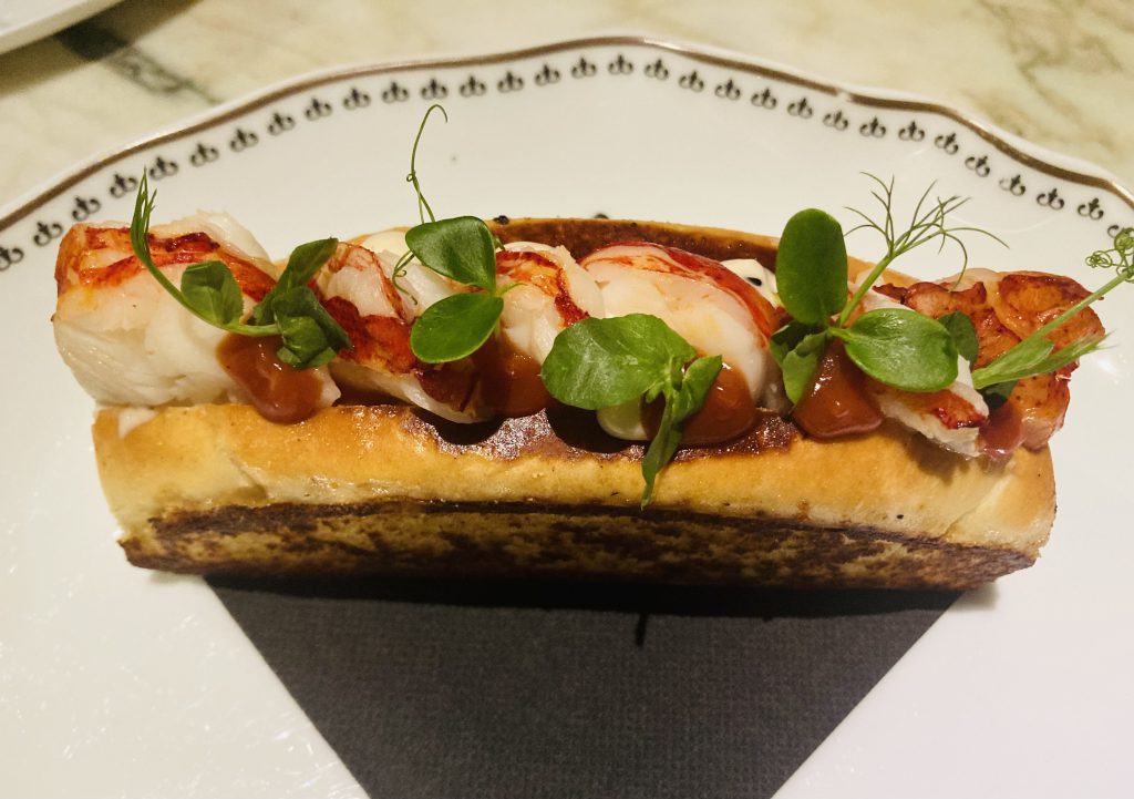 Weiter geht es mit einer Lobster Roll, einem Hummerschwanz im buttrigen Brioche mit einer präzise abgeschmeckten Sesame-Mayonnaise. Hummer mit Biss und Geschmack, doch gegen das gar groß dimensionierte Brötchen kommt das edle Getier nicht an (28 €).