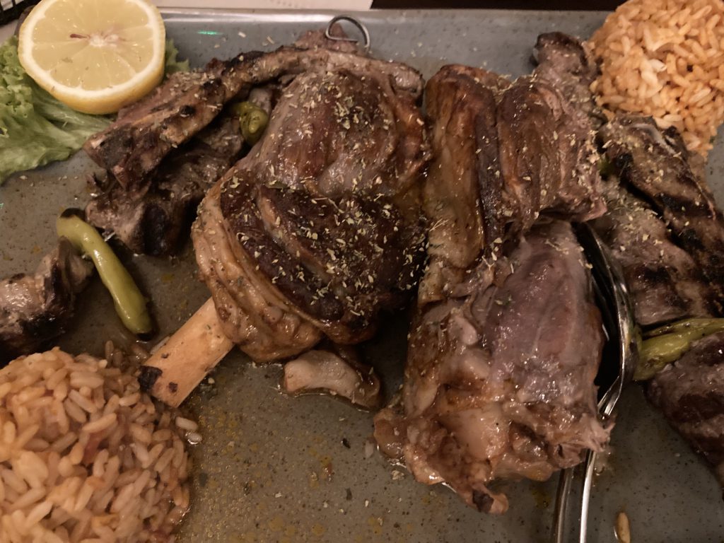 Der griechische Bauernsalat, ebenfalls Teil der Platte, ist unspektakulär, aber gut dimensioniert. Die eigentliche Platte wird dann mit ernsthafter Miene aufgetragen. Zwei Lammkoteletts, zwei Spieße, sowie zwei Stelzen. Okay, die Koteletts waren an diesem Freitag, es war extrem viel los, etwas trocken geraten. Ideal gegrillt hingegen die Spieße. Saftig, rauchig, zart, mit etwas Biss. Das Highlight, das butterzart gegarte Lamm, fällt bereits bei einem sanften Lufthauch vom Knochen. Genau so gehört das.