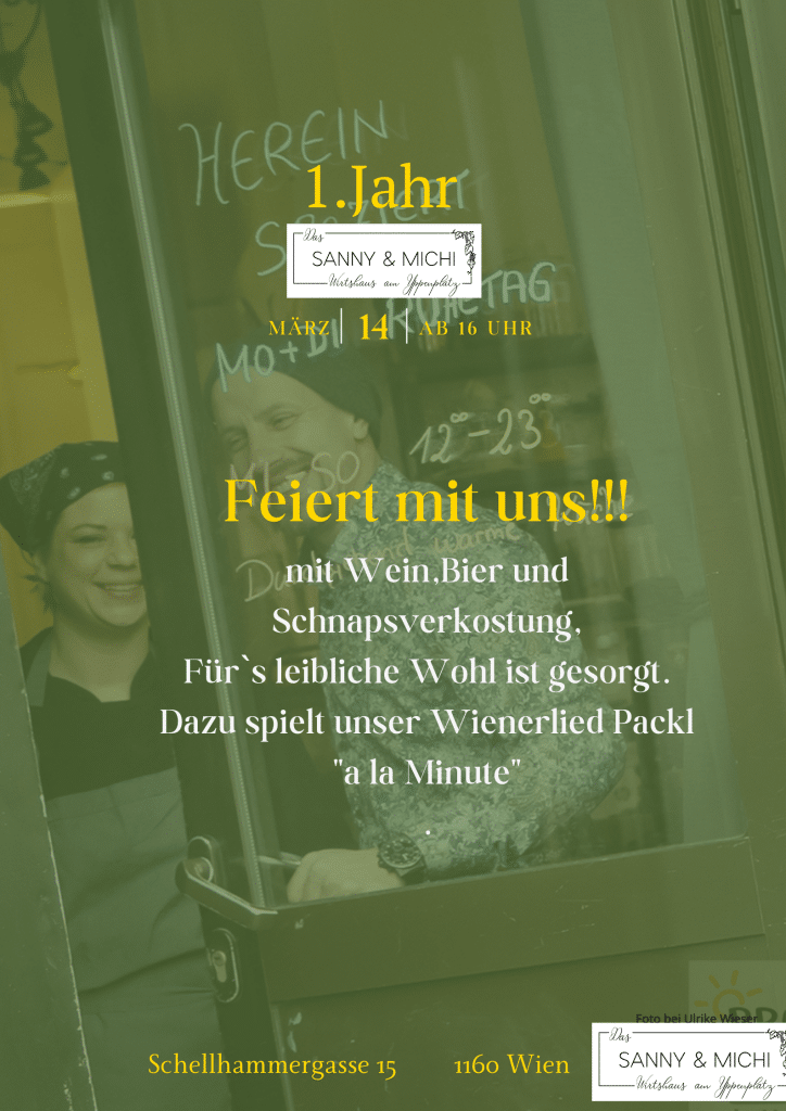 Wien, 1160 – Ein Jahr voller Leidenschaft, Wiener Schmäh und traditioneller Wirtshauskultur: Sanny & Michi feiern ihr erstes Jubiläum! Was als Lebenstraum begann, hat sich in kurzer Zeit zu einem beliebten Treffpunkt für Wiener Gemütlichkeit entwickelt. Am 14. März ab 16 Uhr laden die beiden Gastronomen zur großen Feier in der Schellhammergasse 15 ein – mit Wein-, Bier- und Schnapsverkostung, bester Wiener Küche und musikalischer Begleitung durch das Wienerlied Packl „a la Minute“.